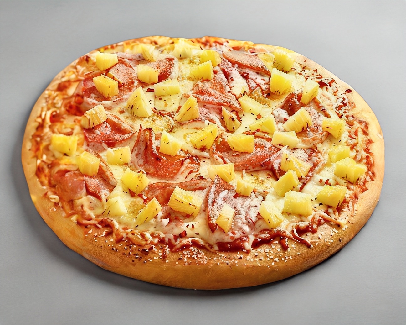 Base de salsa de tomate, queso mozzarella, jamón y piña.