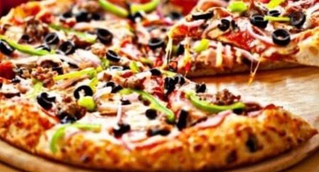 Base de salsa de tomate, queso mozzarella, tocino, salchicha italiana, pepperoni, chile morrón y aceituna.