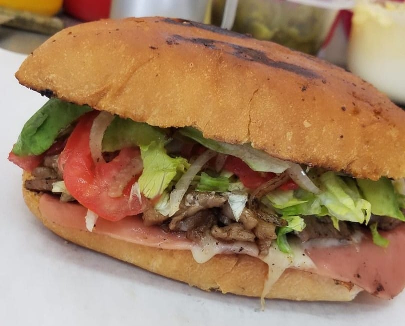 Torta de carne asada, jamón y queso mozzarella. Lechuga tomate aguacate cebolla asada chile.