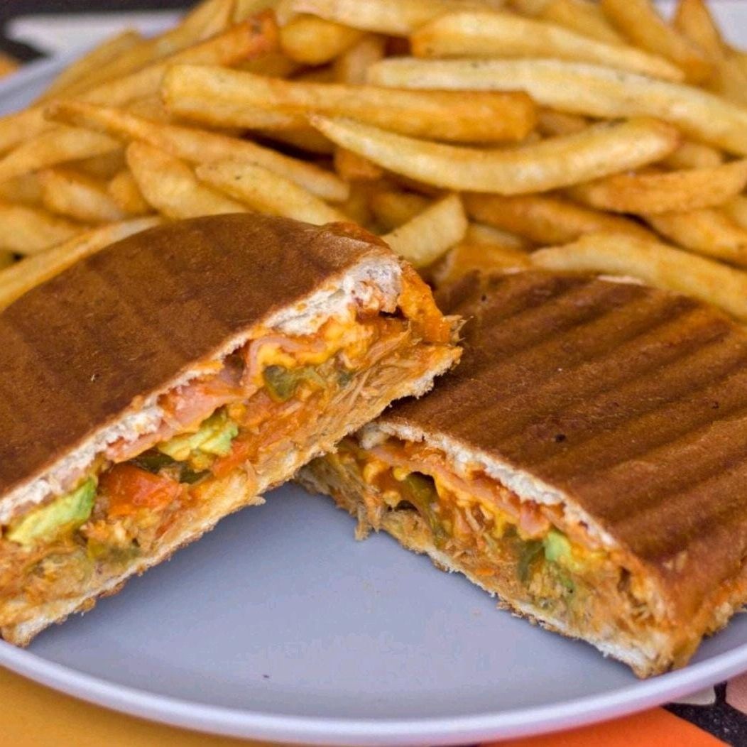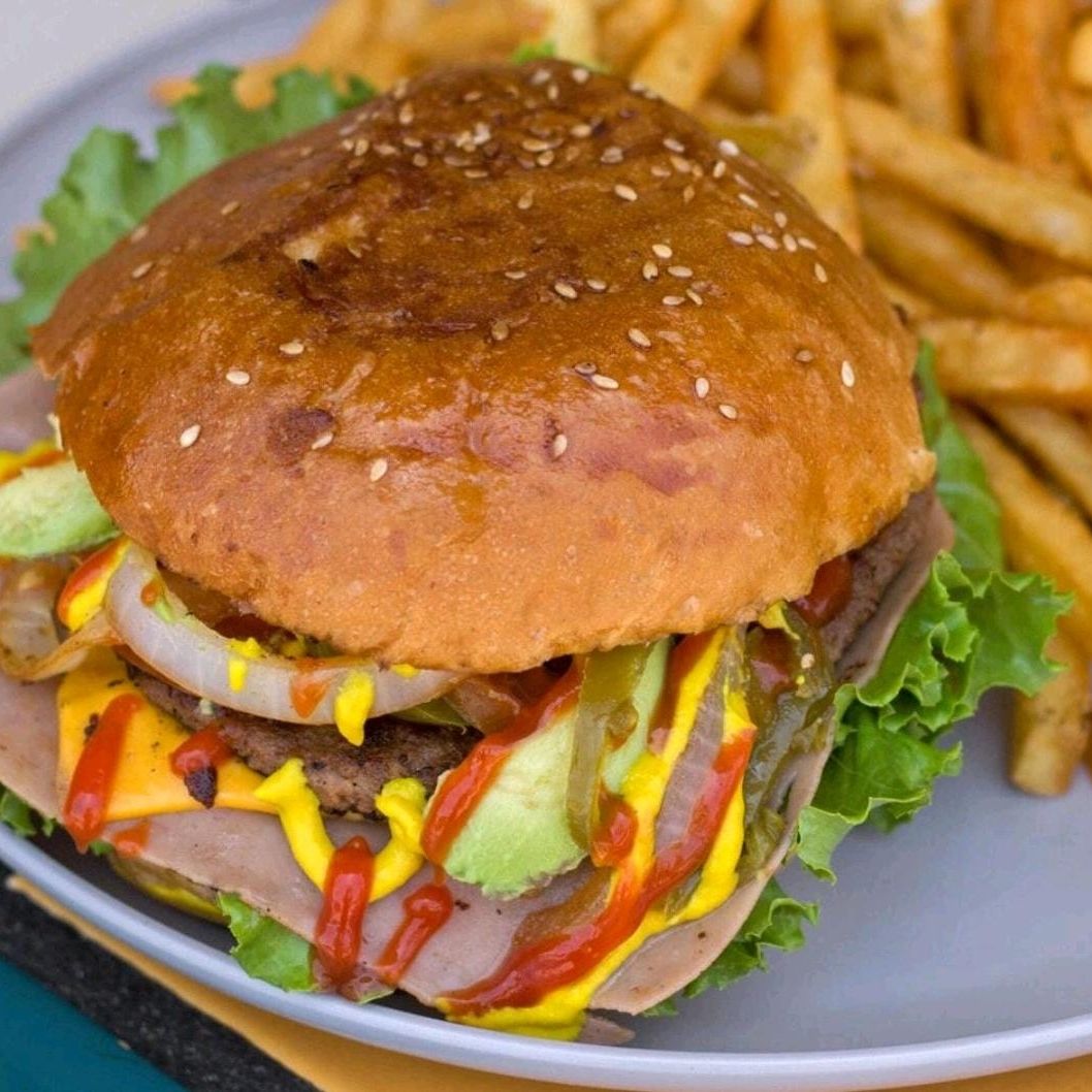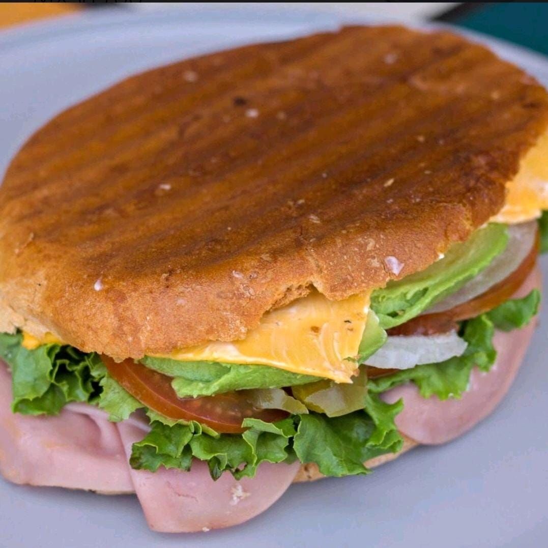 Torta de milanesa (res o pollo) jamón y queso mozzarella. Lechuga tomate aguacate cebolla asada.
