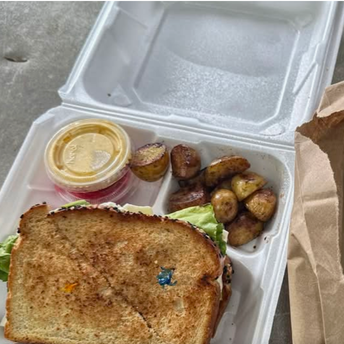 Panela, lechuga romana, tomate, aguacate y pan multigrano, acompañado de papas mediterráneas.