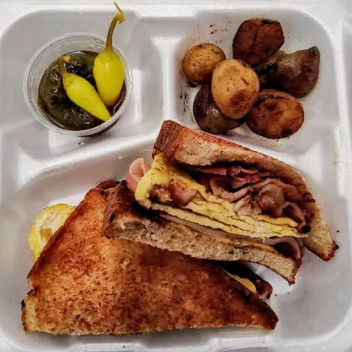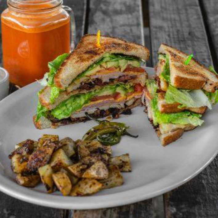 Jamón de pavo, pechuga de pavo, tocino, huevo y queso americano, acompañado de papas mediterráneas.