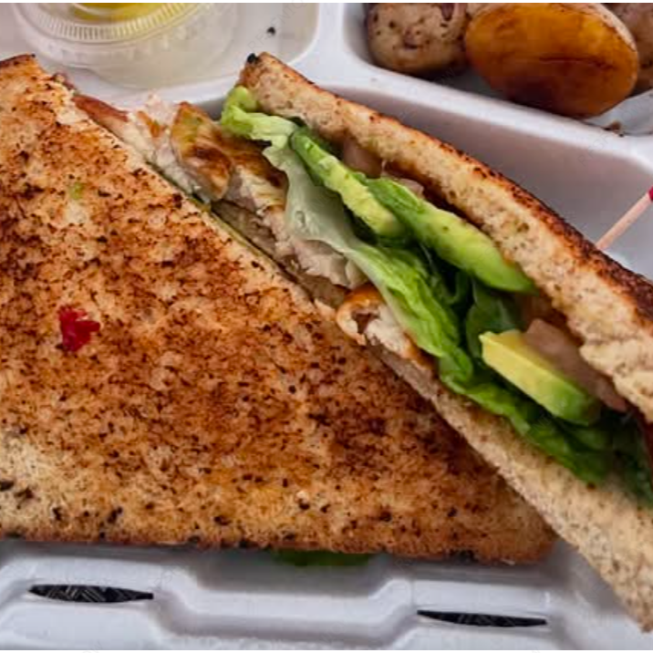 Pechuga de pollo a la plancha, queso monterrey, lechuga, tomate, aguacate y pan multigrano, acompañado de papas mediterráneas.