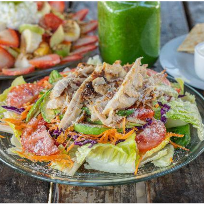 Una cama de lechuga romana, zanahoria, aguacate, pimiento, tomate, repollo morado, un toque de aceite, vinagre y no puede faltar el queso parmesano, aderezo ranch aparte.
