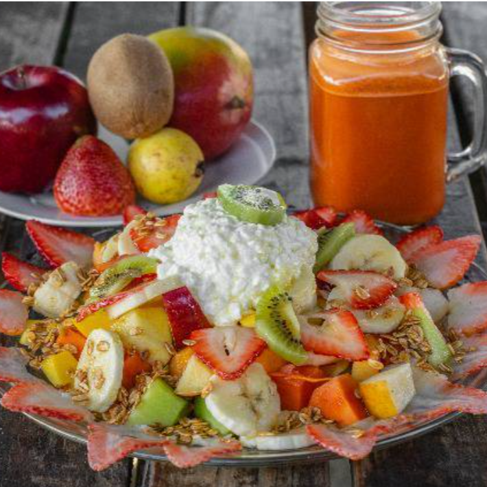 Fruta dulce de temporada acompañada de queso cottage, miel y granola