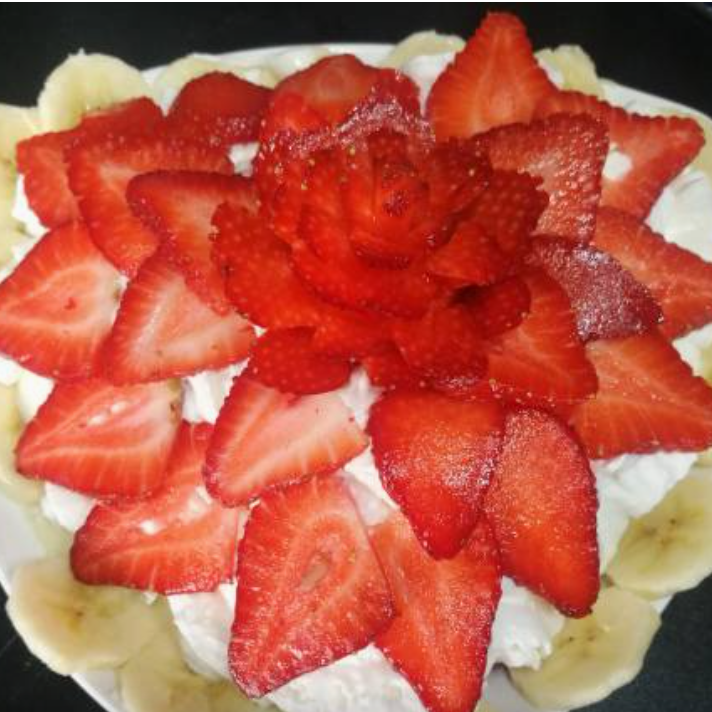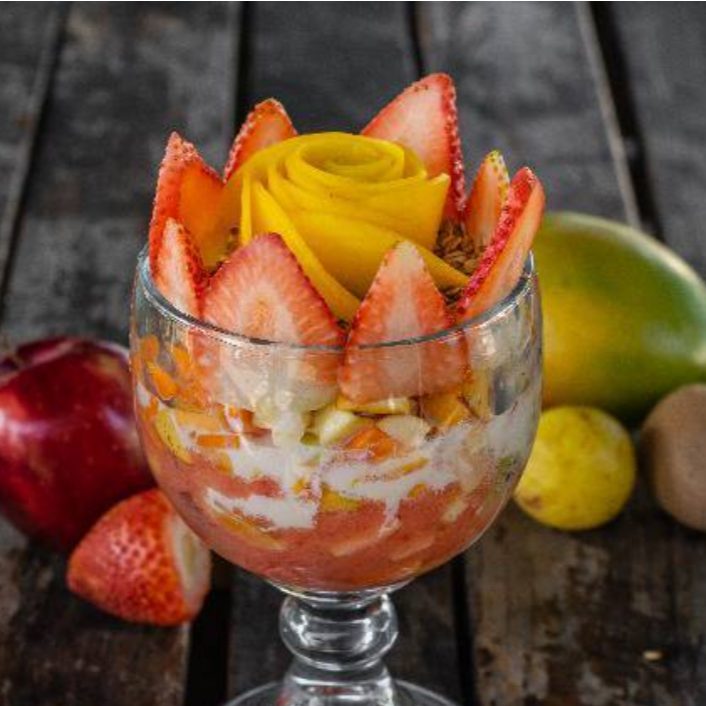 Fruta dulce de temporada servida en vaso, una base de jugo de fresa, naranja, un top de lechera y granola.