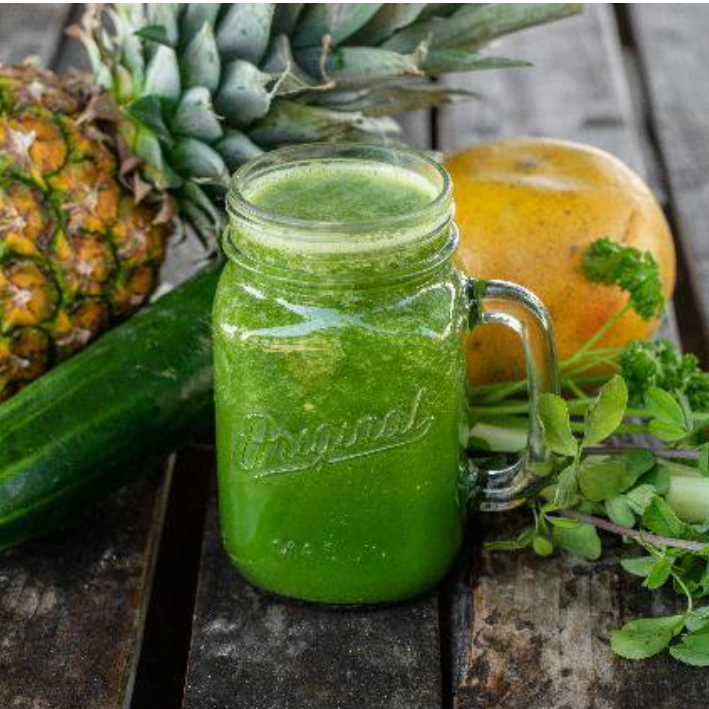 Nopal, piña, espinaca, apio, alfalfa, perejil y jugo de toronja.