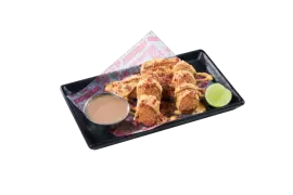 Súper crujientes tiritas de pechuga de pollo (300 g) con empanizado spicy, servido con salsa Tequiler y cebollita sazonada. Guarniciones de guacamole y elotito preparado.