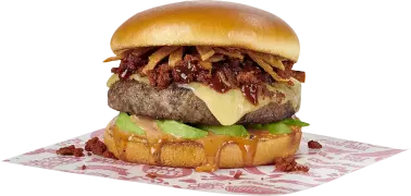 Delicioso tocino doradito, aros de cebolla empanizados, salsa Texas BBQ, queso cheddar derretido sobre una jugosa carne de res (200g) condimentada con nuestra mezcla secreta de especias.