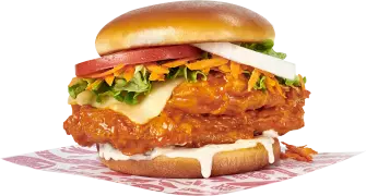 ¡Nuestro más grandioso sándwich! Crujiente pechuga de pollo (230 g) empanizada y bañada en nuestra salsa Original, con queso manchego, lechuga, tomate, cebolla, zanahoria rallada y aderezo Blue Ranch en pan brioche.