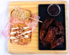 Suaves y jugosas costillitas (210 g) servidas con nuestras emblemáticas Alitas (420 g) con la salsa que prefieras, aderezo Blue Cheese y vegetales frescos. Lleva como guarnición medio elotito preparado.