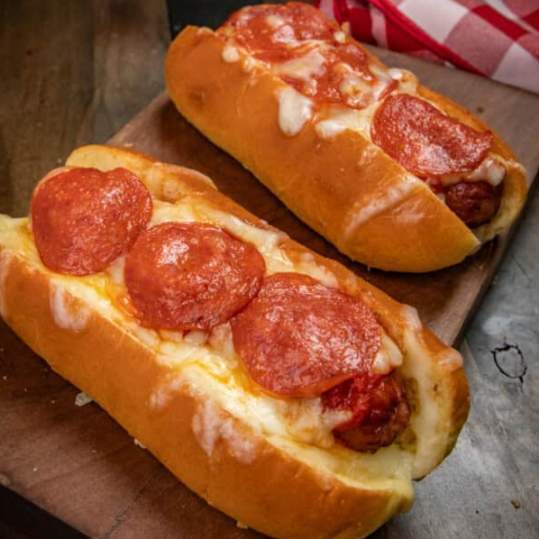 dos hot dogs con espeicalidad de peperoni y queso gratinado con una salchicha jumbo