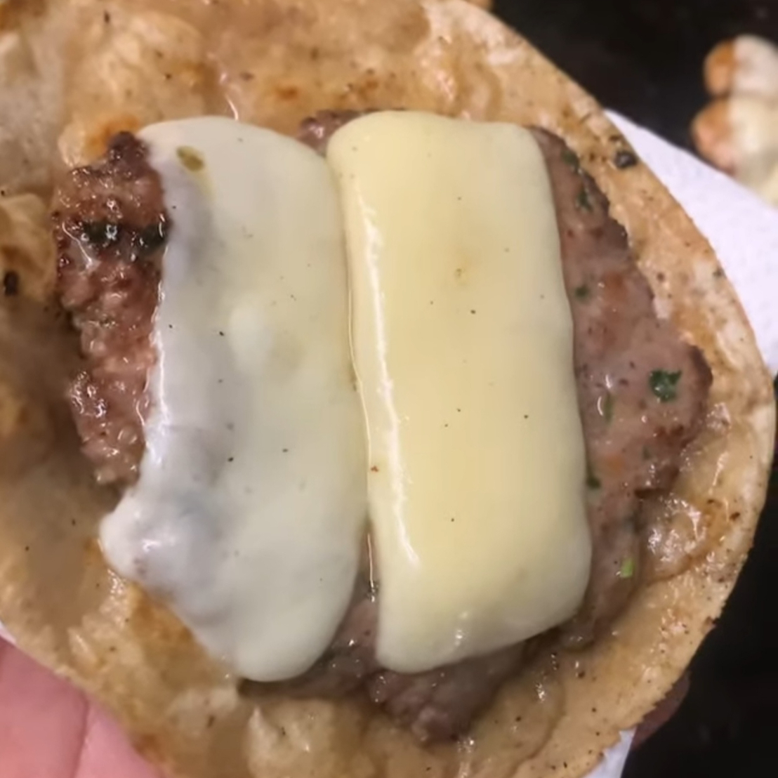 tortilla de maiz, carne hamburguesa artesanal casera, queso gratinado,