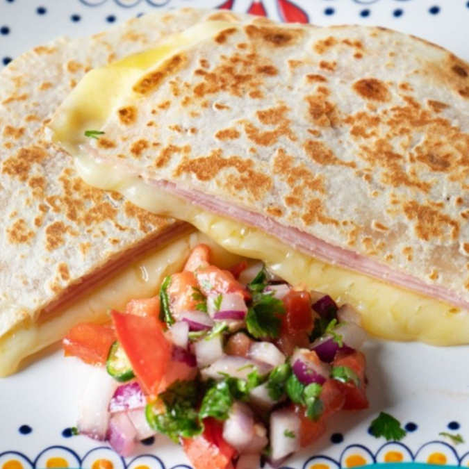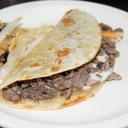 tortilla de harina, carne asada, queso gratinado, salsa, cebolla asada, y extras.