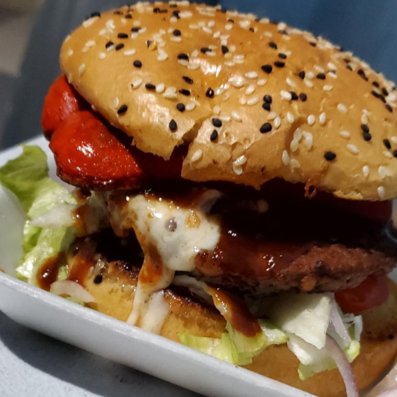carne artesanal casera, verduras, queso americano, aderezos y mas.