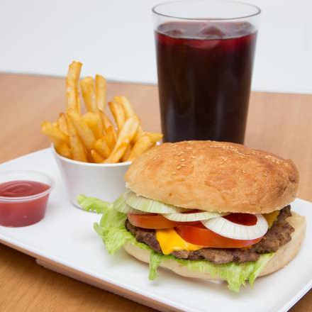 incluye hamburguesa con piña, papas fritas, bebida de sabor natural 100 %