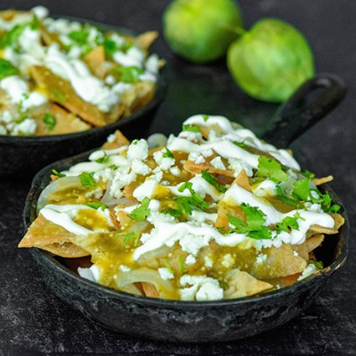 Totopos crujientes en salsa verde de tomatillo con el toque exacto de picante.