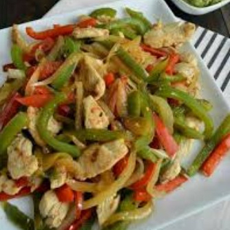 Tiras de pechuga de pollo salteadas con pimientos y cebollas, llenas de sabor y color.