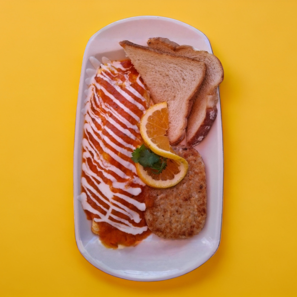 OMELLETE SALSA CHIPOTLE RELLENO DE PECHUGA Y QUESO CON PAPA CHILAQUIL Y FRIJOL CON CAFE