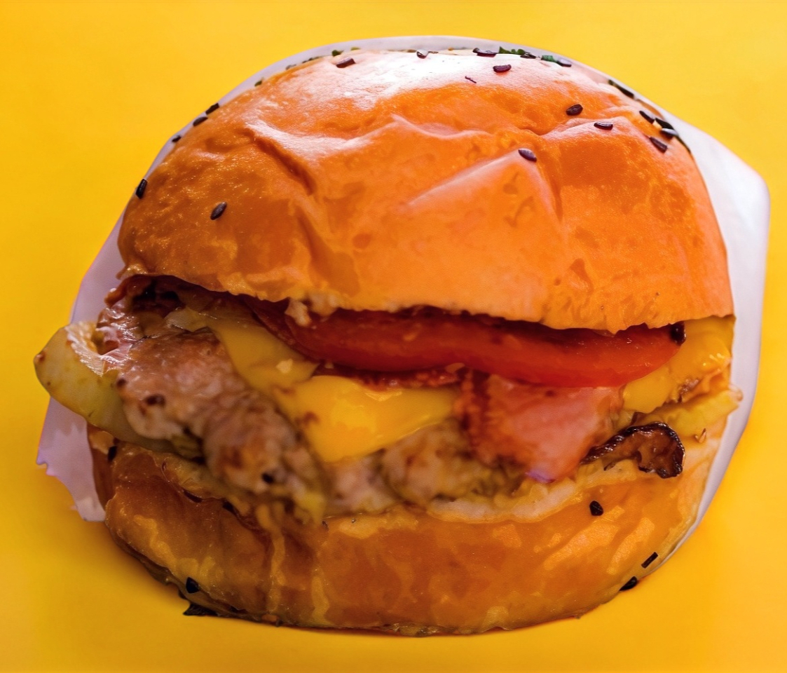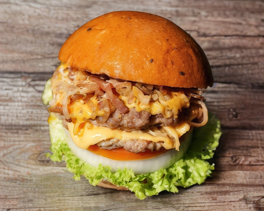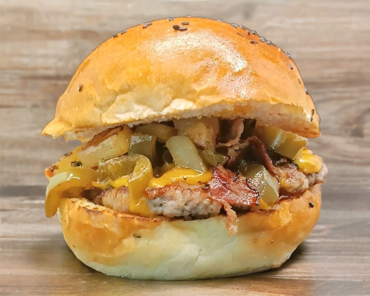 una explosión de sabores tradicionales con un toque gourmet. Un jugosa pieza de carne de res de primera calidad, cocinado a la perfección y coronado con una cama de cebollas caramelizadas lentamente en jugo de carne, tomates asados. Todo ello envuelto en un suave pan artesanal tostado
