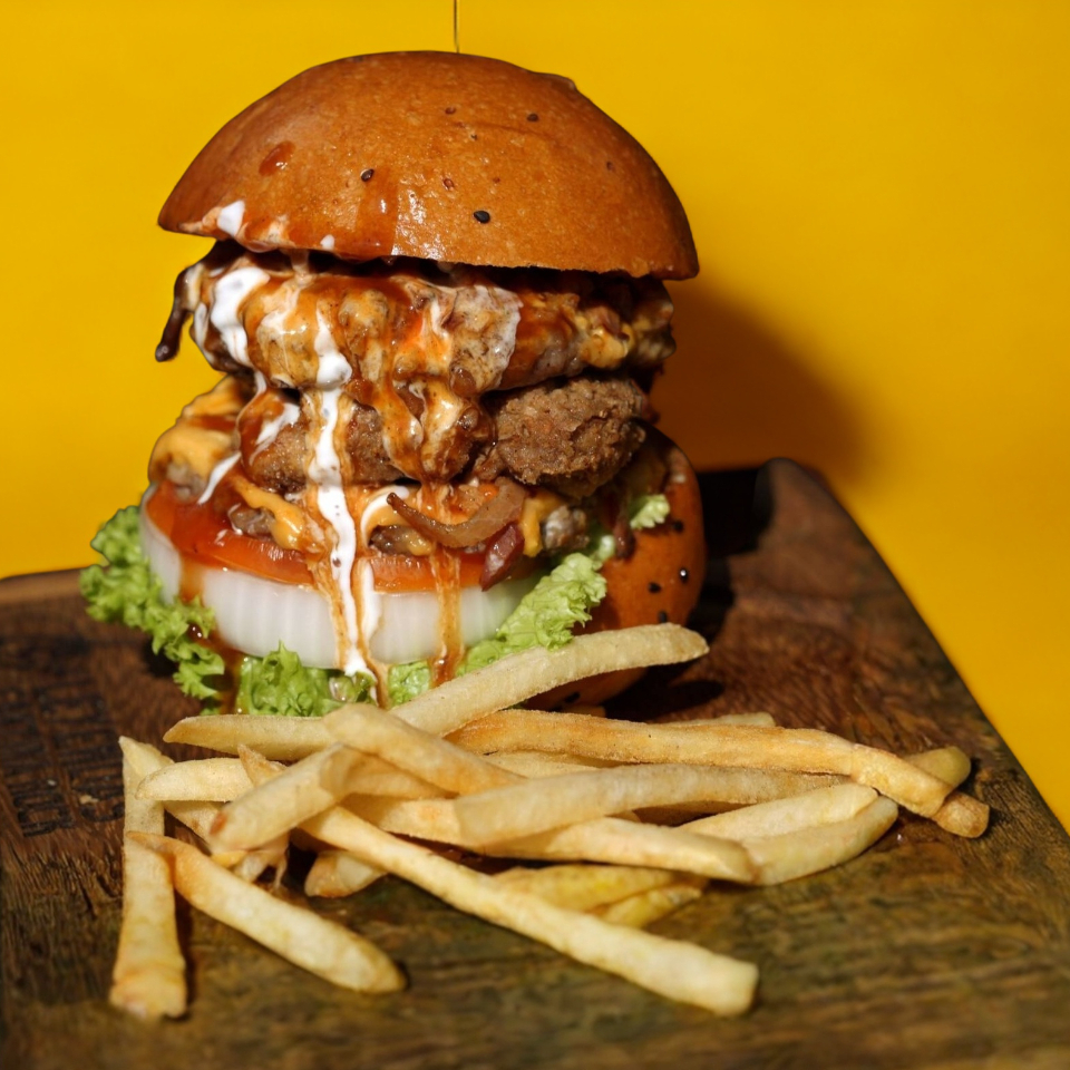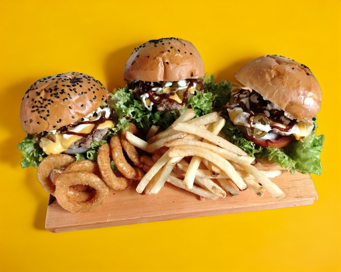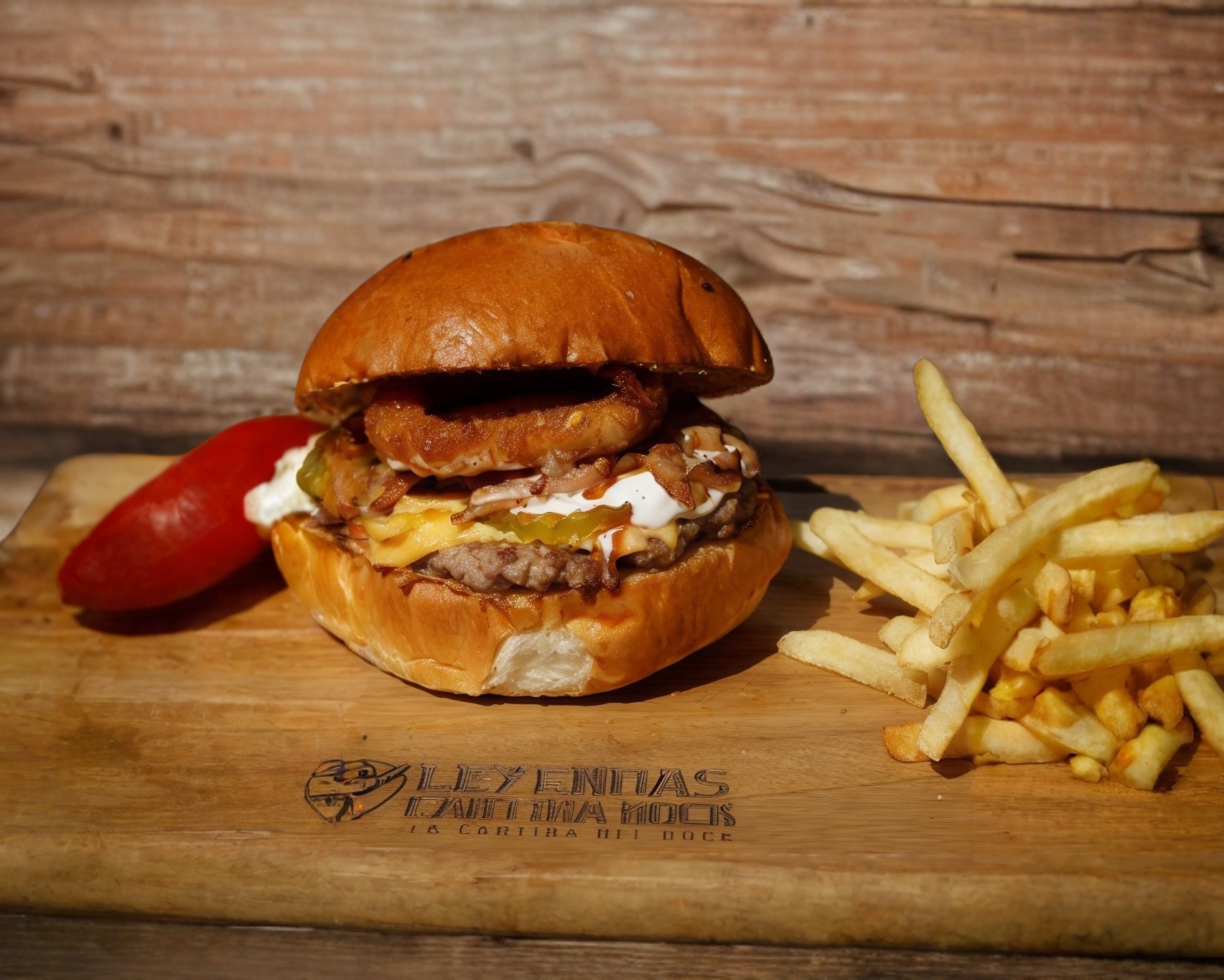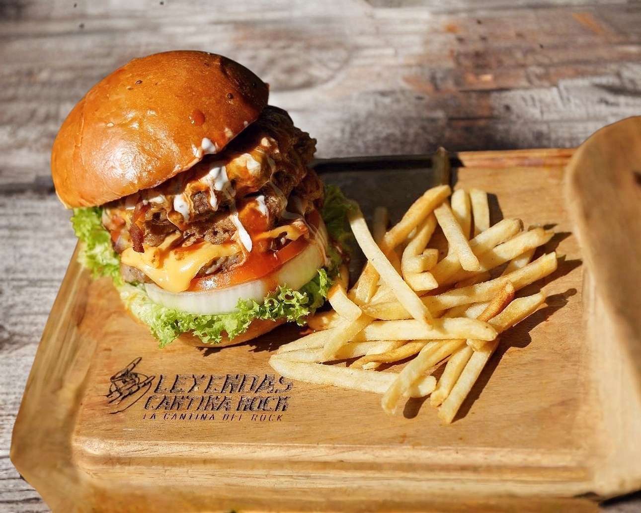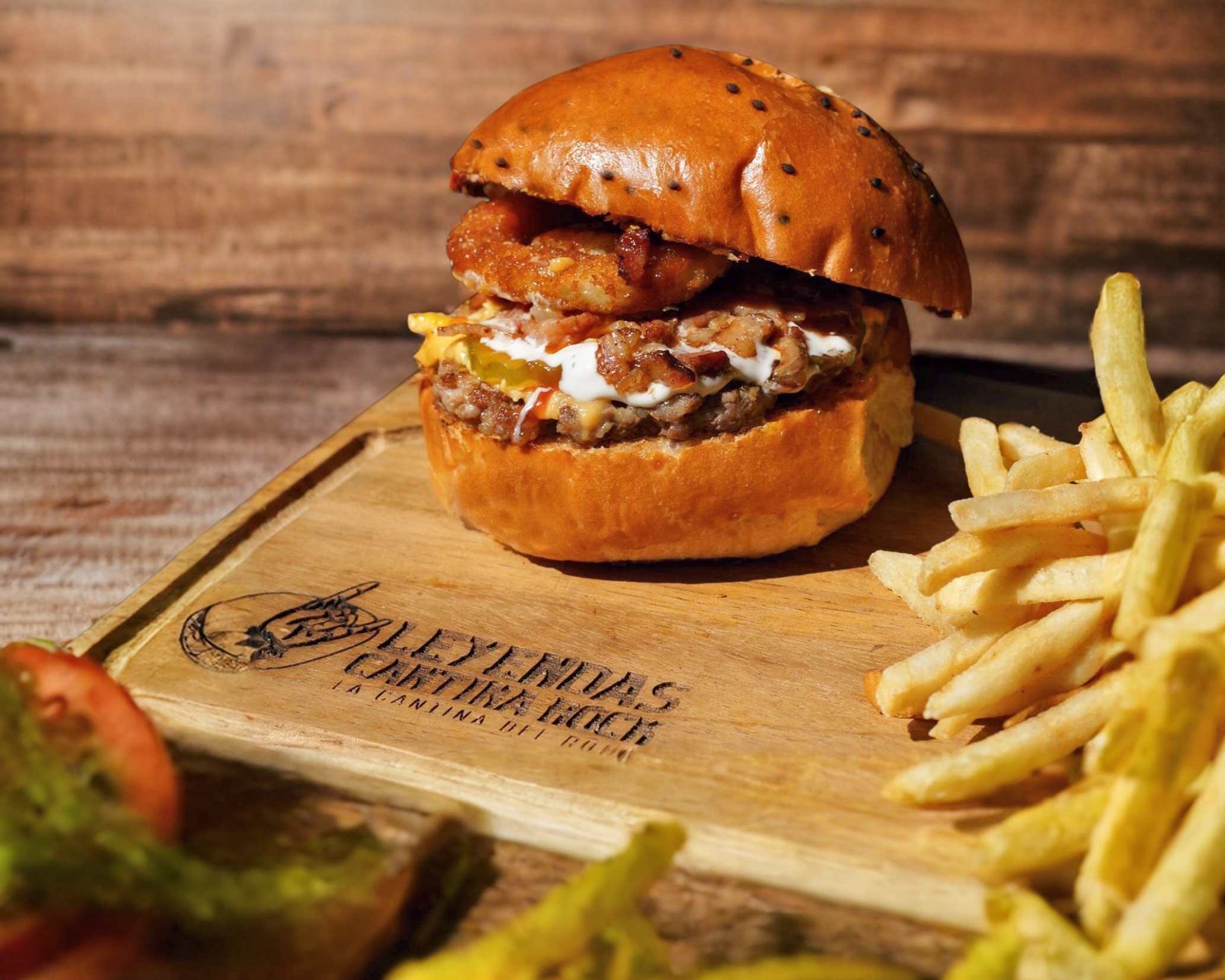 Prepárate para rockear tu paladar, una jugada de res de primera calidad, cocinados a la perfección y coronados con queso cheddar derretido, crujientes tiras de tocino ahumado, crujientes aros de cebolla y nuestro bbq mesclado cuidadosamente con el ranch de la casa, todo ello envuelto en un suave pan artesanal tostado, elaborado con ingredientes frescos y de la más alta calidad.