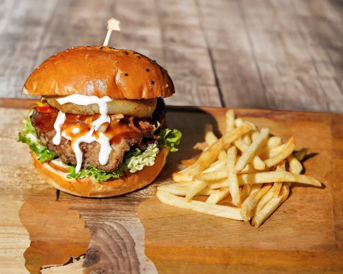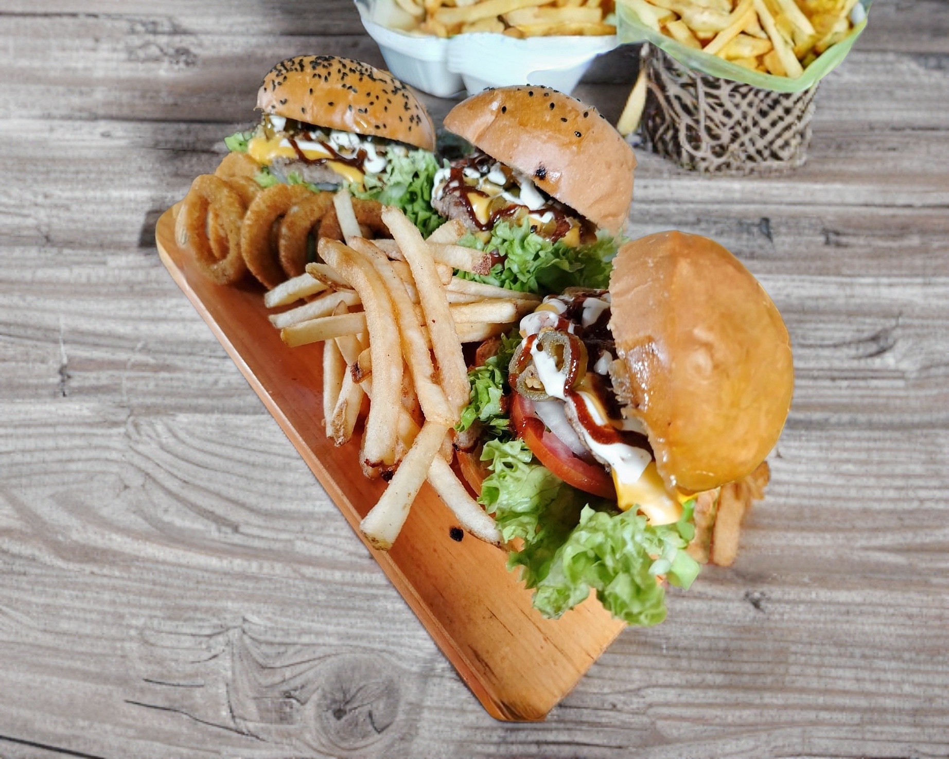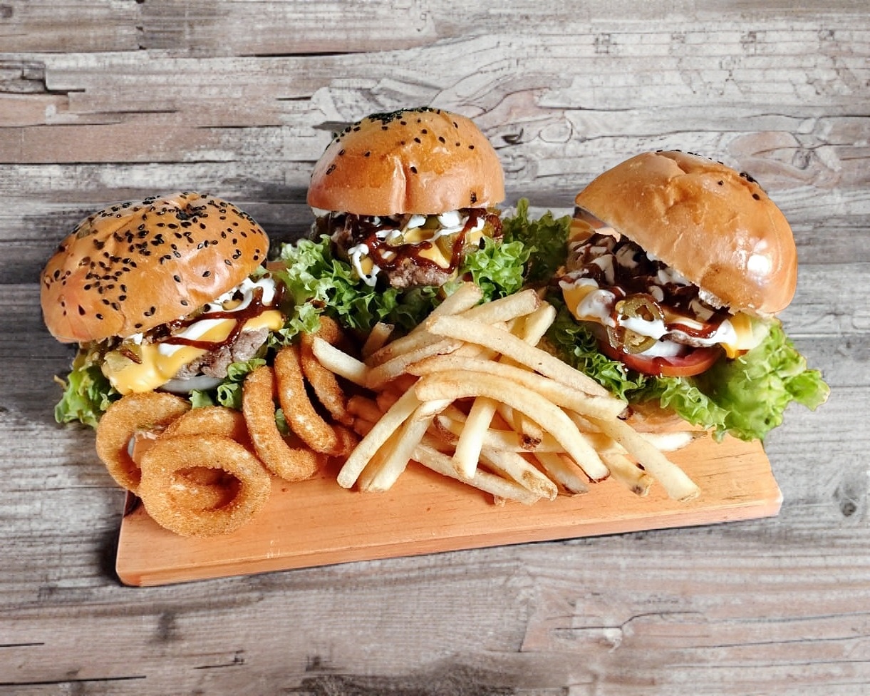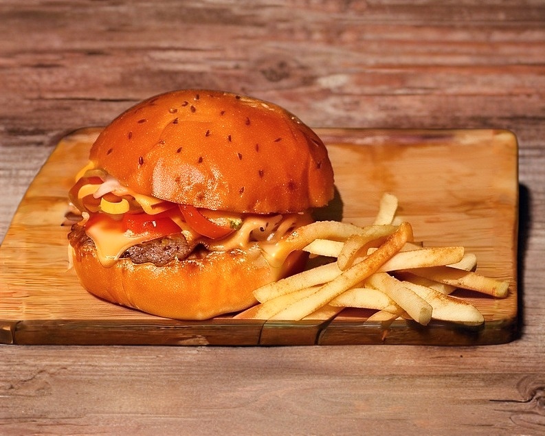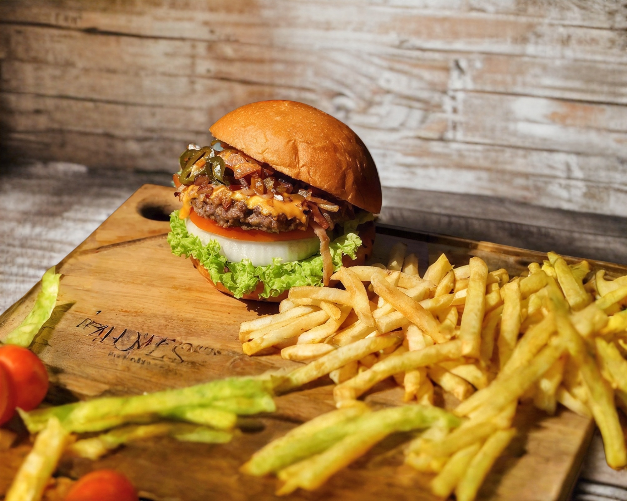 Prepárate para rockear tu paladar, una jugada de res de primera calidad, cocinados a la perfección y coronados con queso cheddar derretido, crujientes tiras de tocino ahumado, crujientes aros de cebolla y nuestro bbq mesclado cuidadosamente con el ranch de la casa, todo ello envuelto en un suave pan artesanal tostado, elaborado con ingredientes frescos y de la más alta calidad.