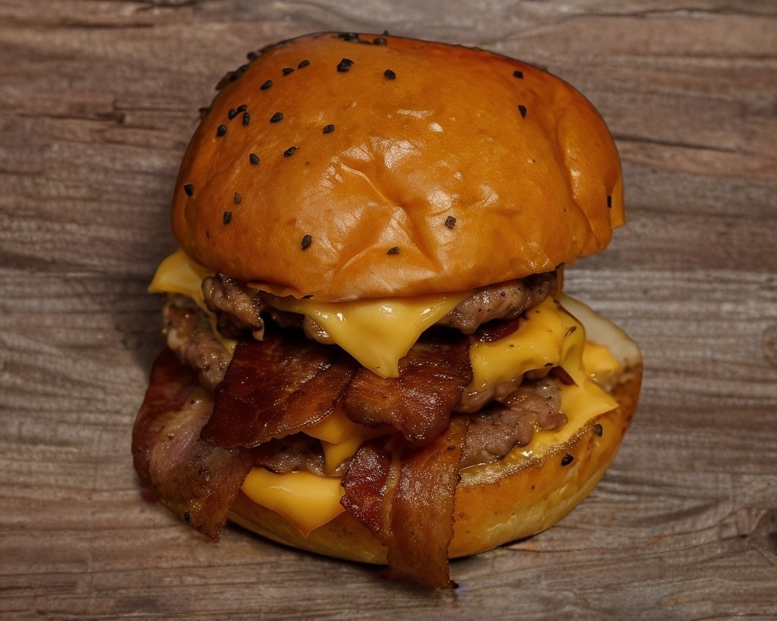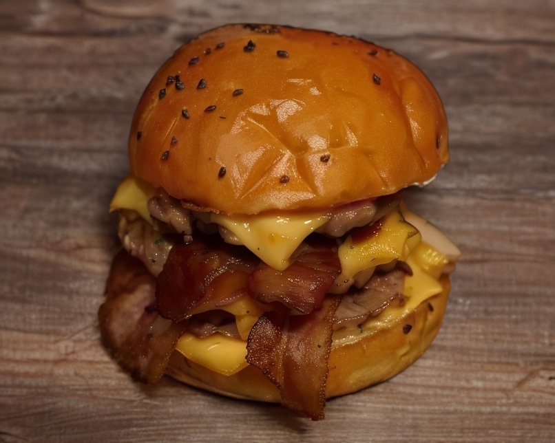 una sinfonía de sabores que te transportará a un estado de euforia absoluta. Tres jugosas piezas de carne de res de primera calidad, cocinados a la perfección y coronados con una doble porción de queso cheddar derretido, crujientes tiras de tocino ahumado y queso de nachos, creando una experiencia deliciosa y única.
