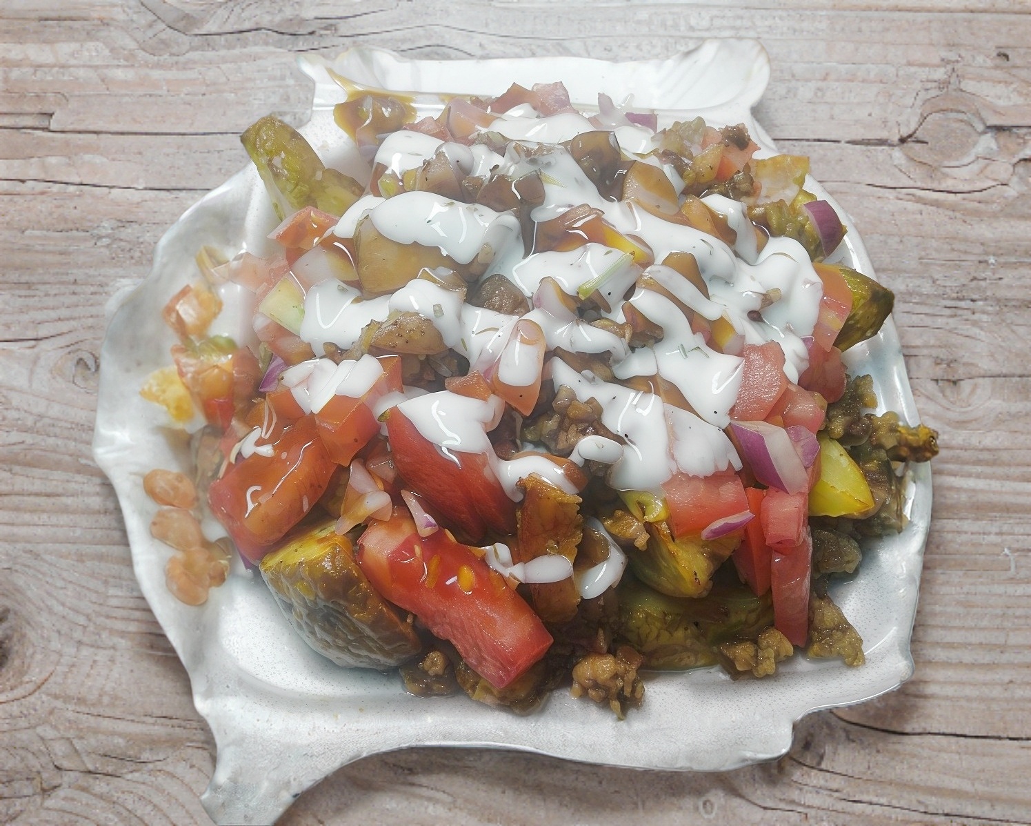 Papa, queso de nachos, carne molida receta de la casa, tomate, cebolla, BBQ, ranch, tocino.