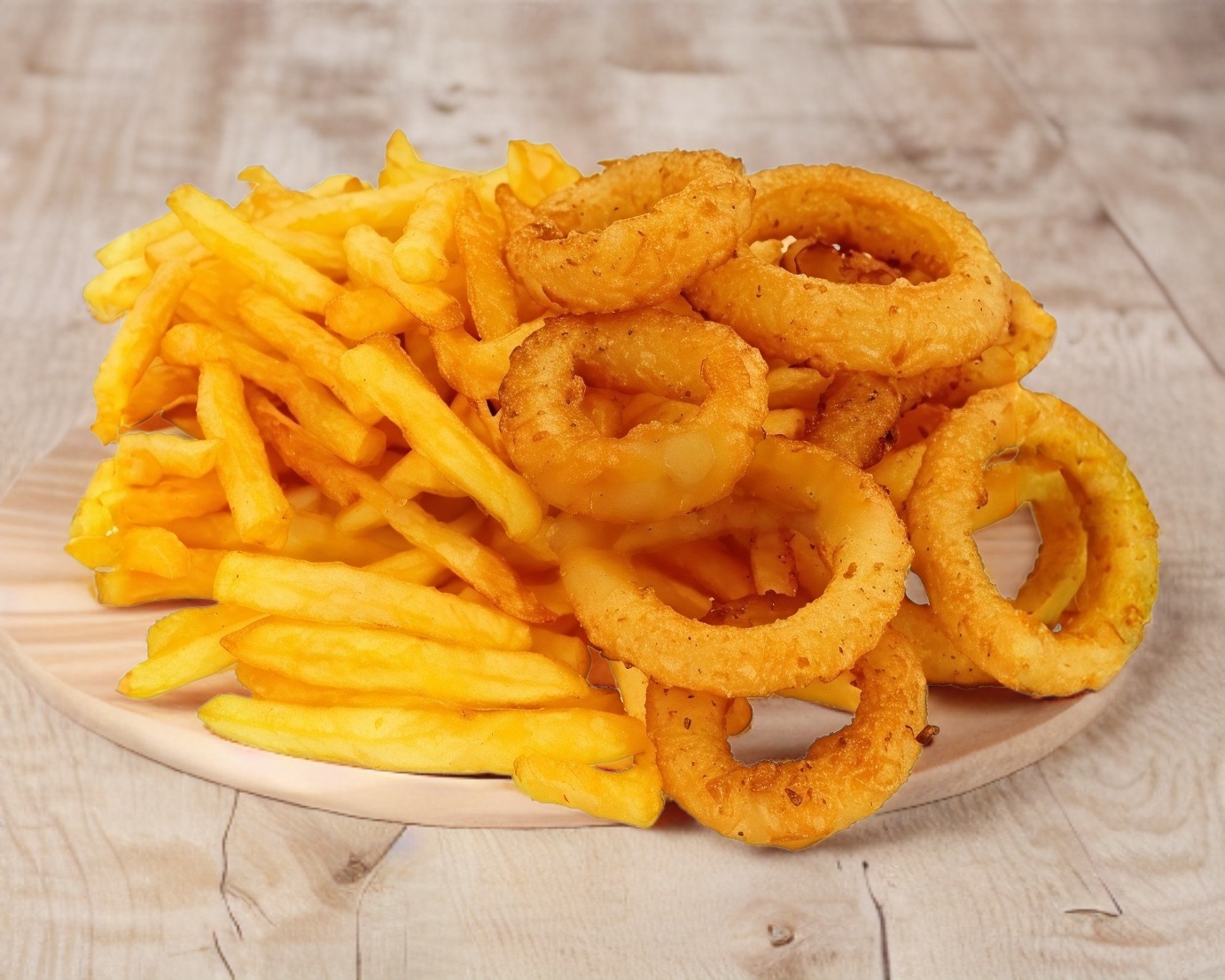 Pan tradicional disfruta de dos carnes de res, queso y tocino con aros de cebolla, bbq, ranch, papas a la francesa y bebida de 400 ml