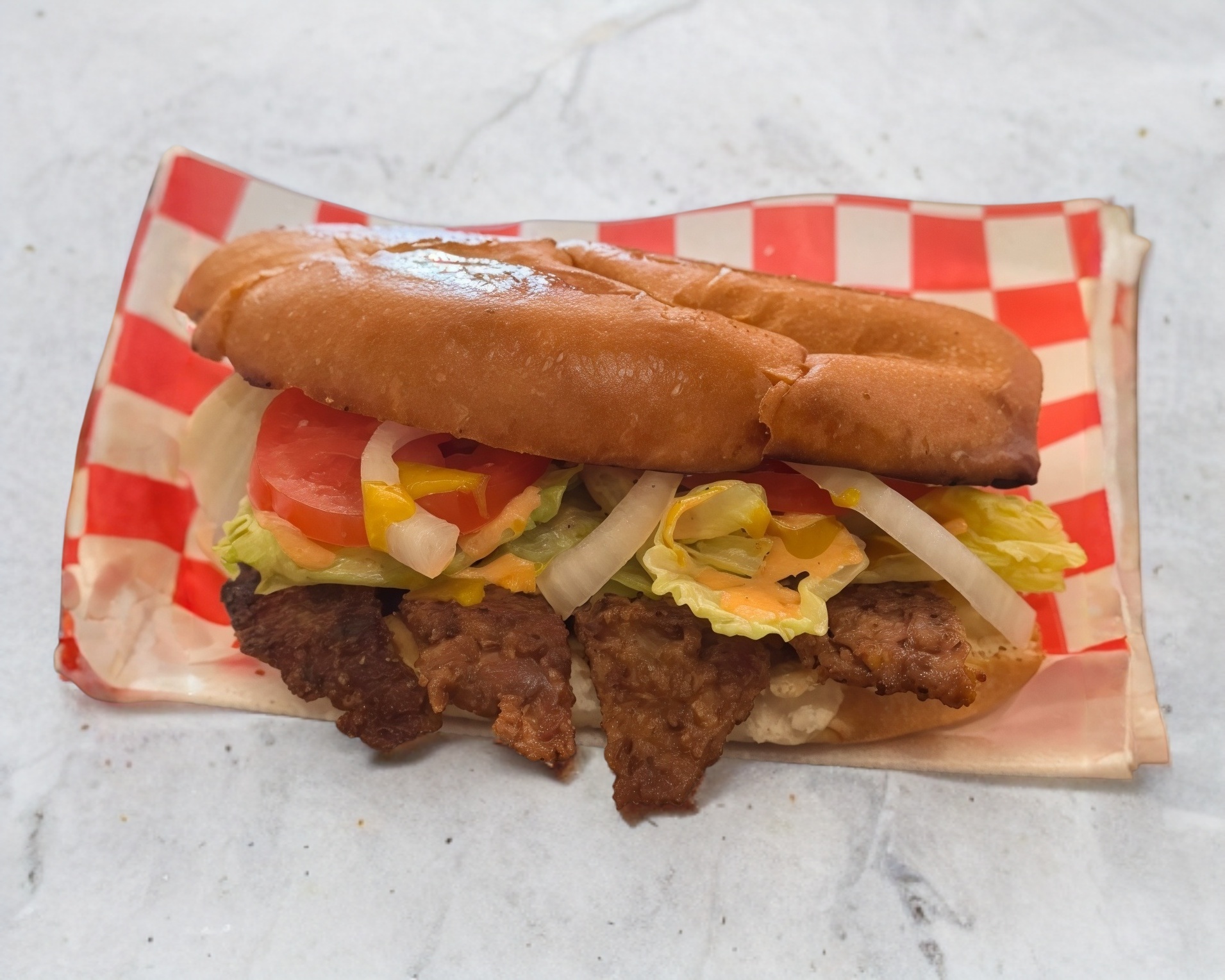 Carne adobada lecguga tomate y cebolla
