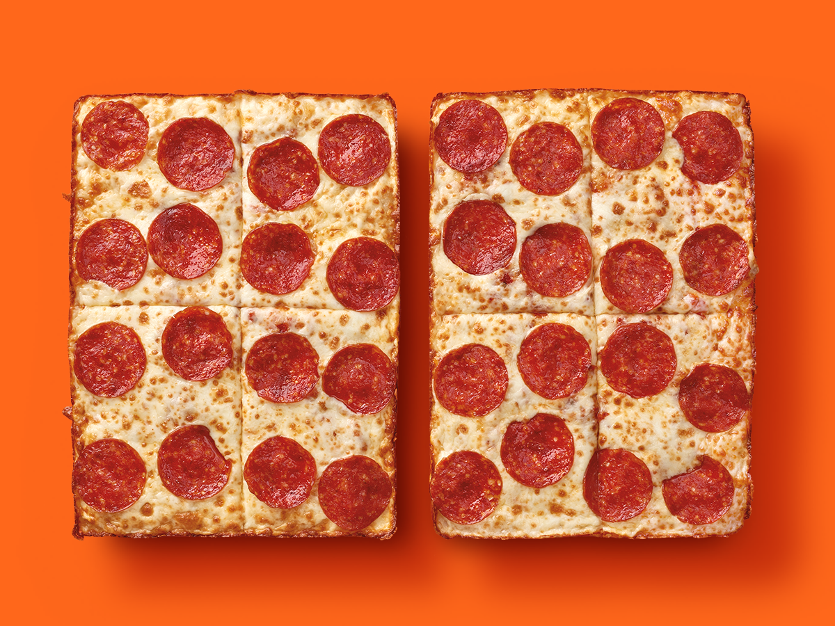 pizza cuadrada y grande de pepperoni con 8 rebanadas con la orilla de queso crujiente