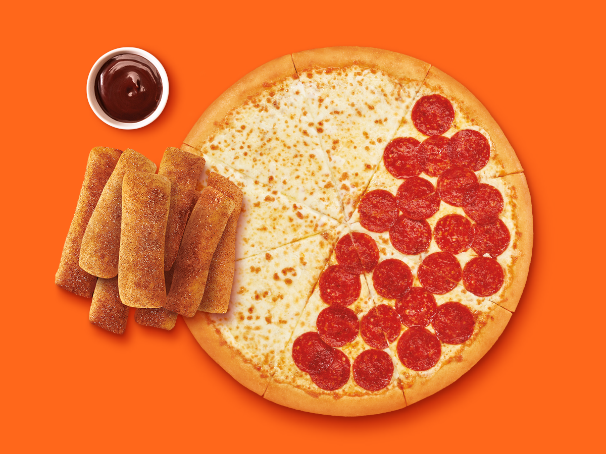 1 pizza Extra Extra Cheddar + 1 CANELA STIX