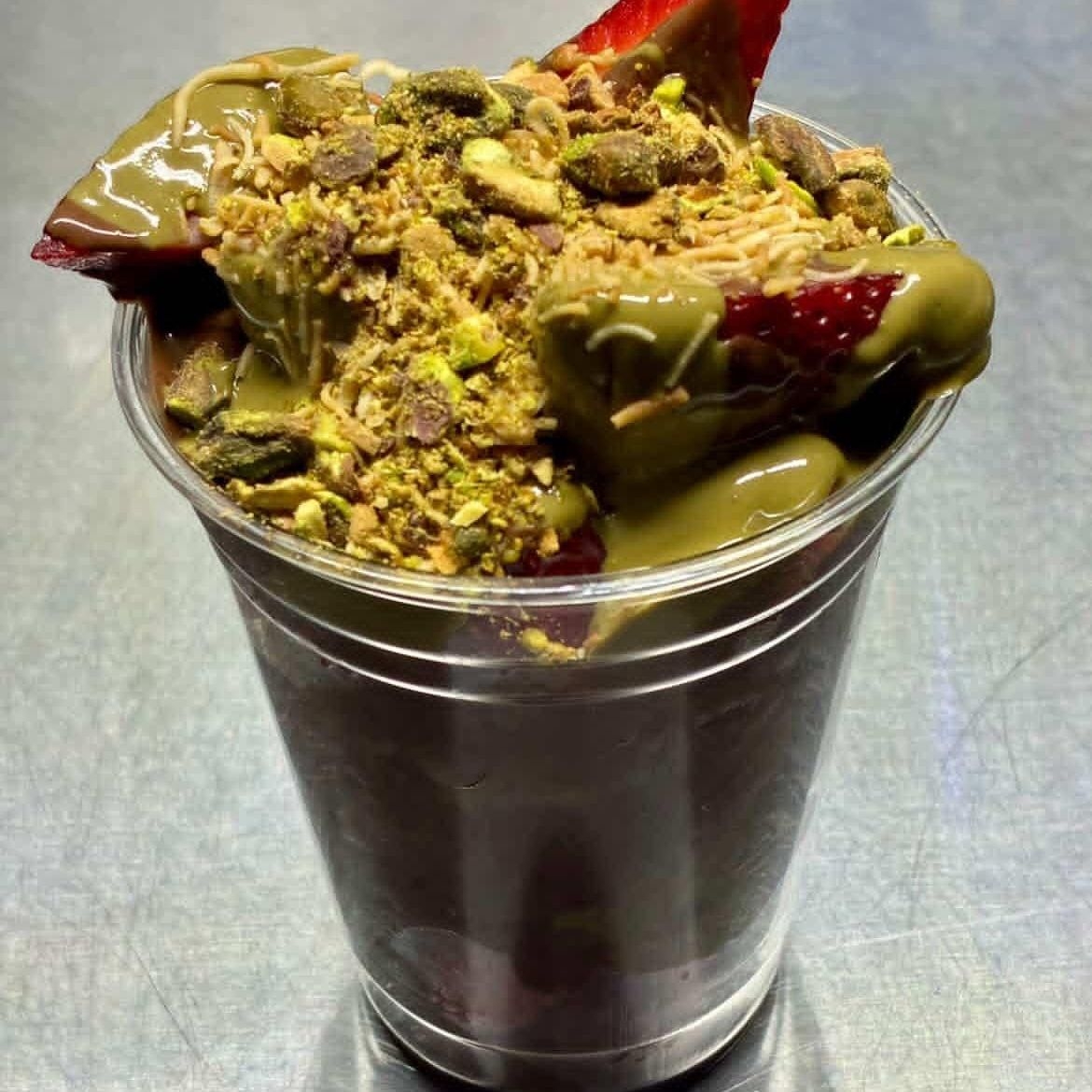 Fresas con crema de pistacho, nutella, kataifi crujiente y topping de pistacho.