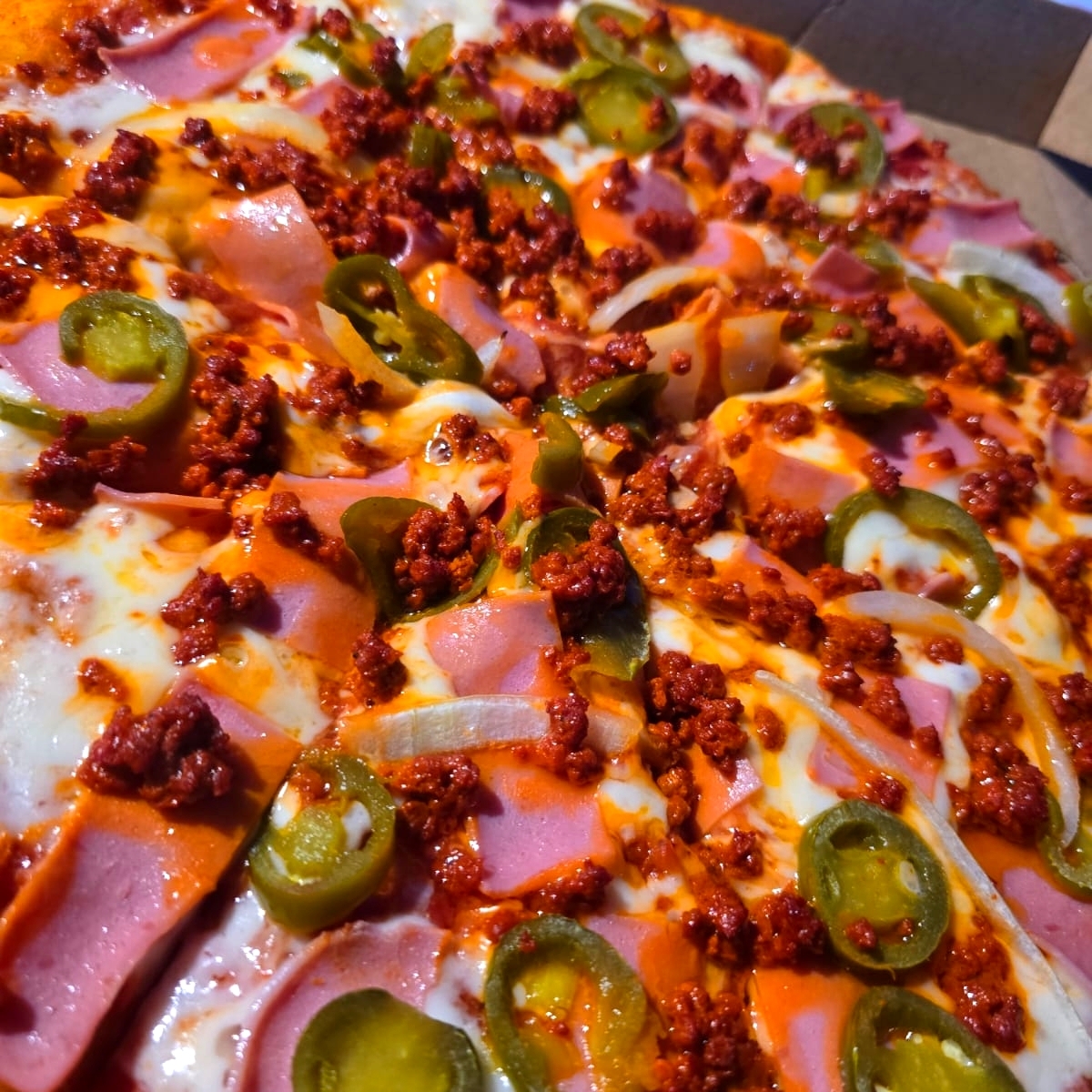 Salsa preparada, queso mozzarella, Jamón (pavo), cebolla blanca, chile jalapeño y chorizo español.