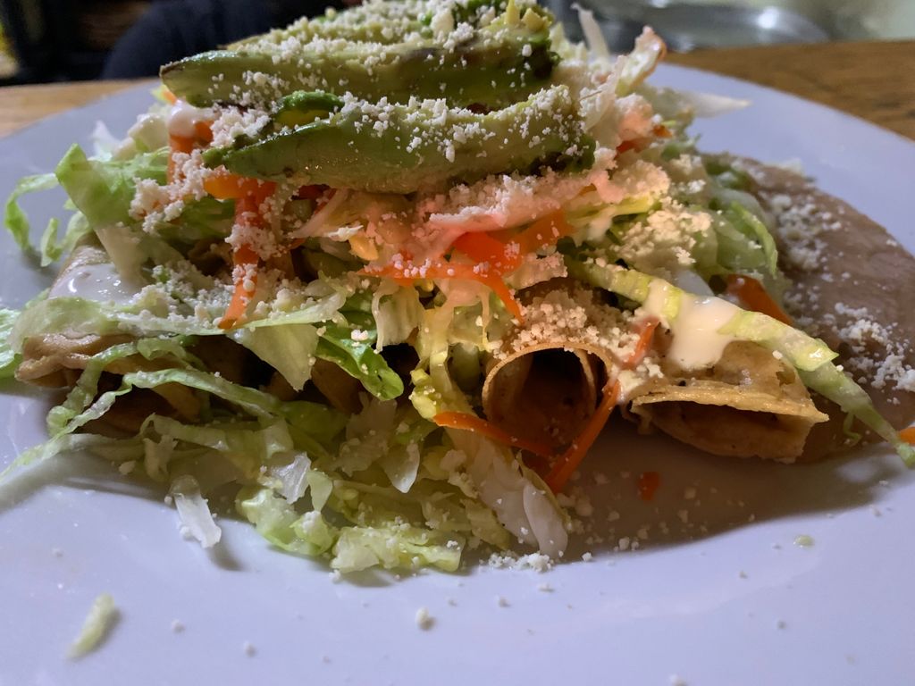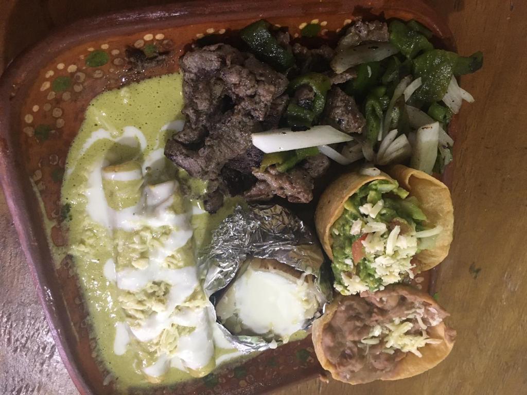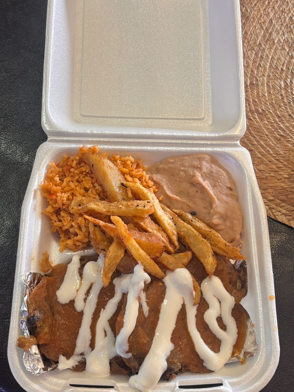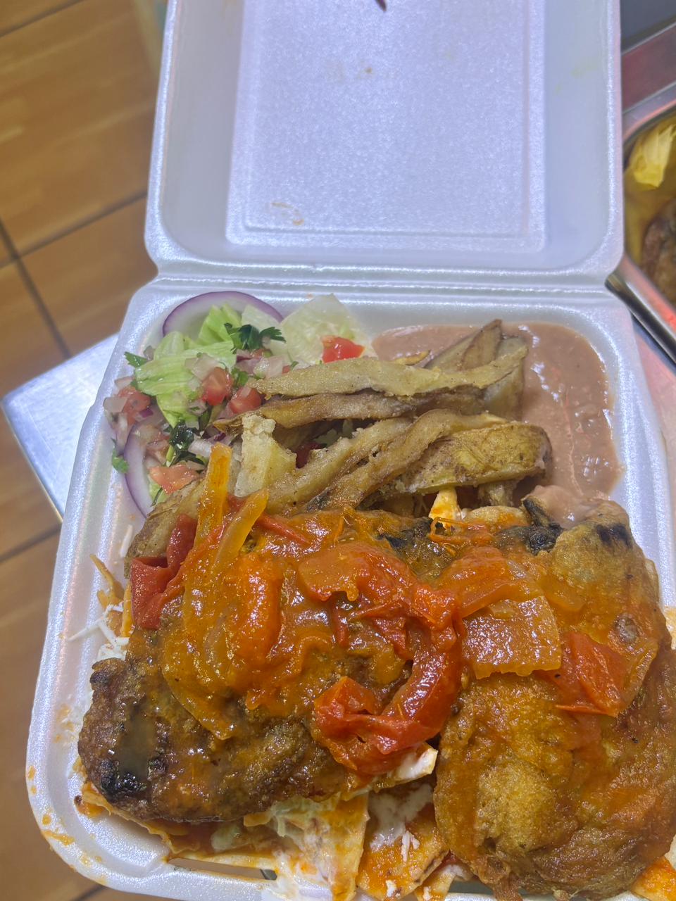 Platillo individual, complementado con ensalada (aparte), frijoles y papas a la francesa.