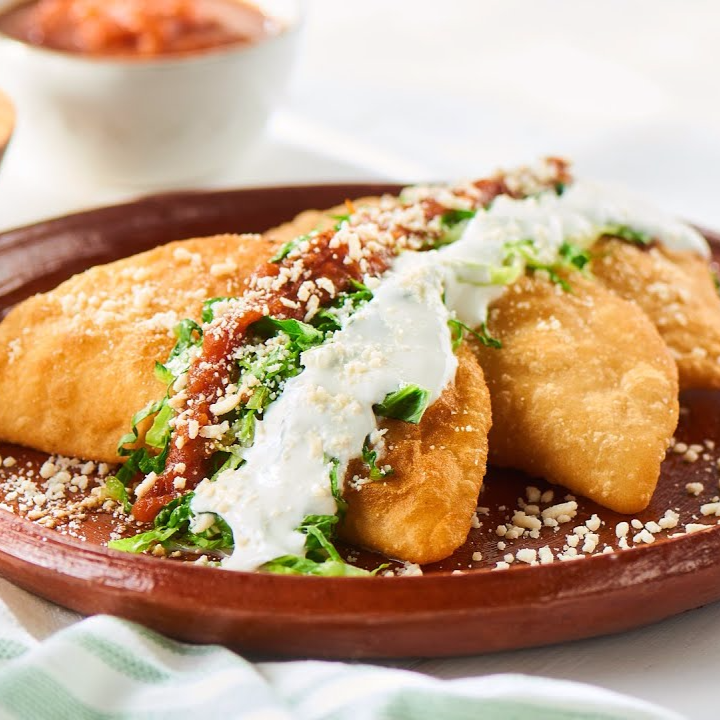 Quesadilla frita rellena de queso y pollo, con una capa de lechuga, salsa de tomate, crema, queso y cebolla curtida.