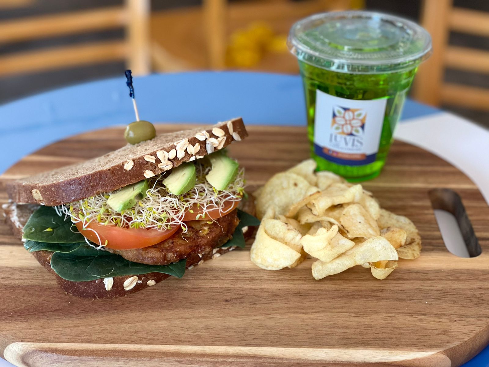 Carne Vegetariana, espinacas, tomate, aguacate, pepino, alfalfa, mayonesa y mostaza.