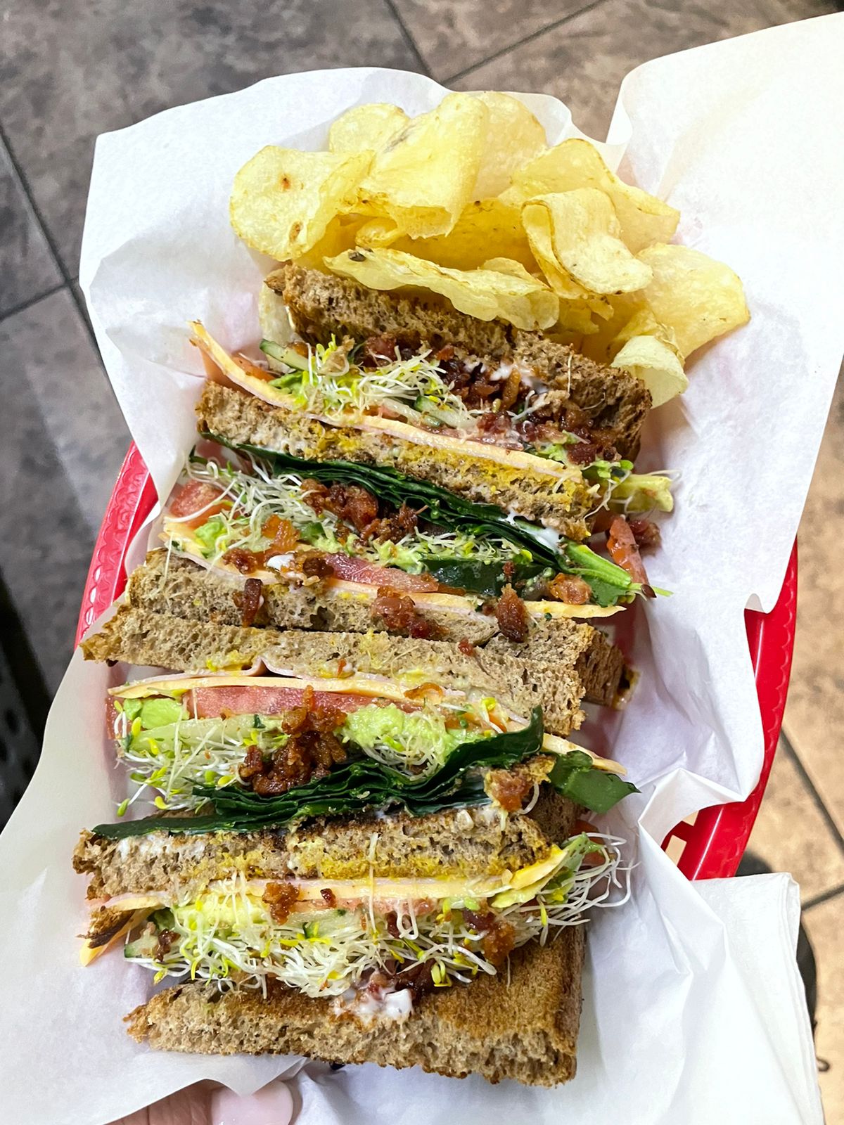 Jamón de pavo, tocino, queso amarillo, tomate, lechuga, alfalfa, pepino, mayonesa y mostaza.