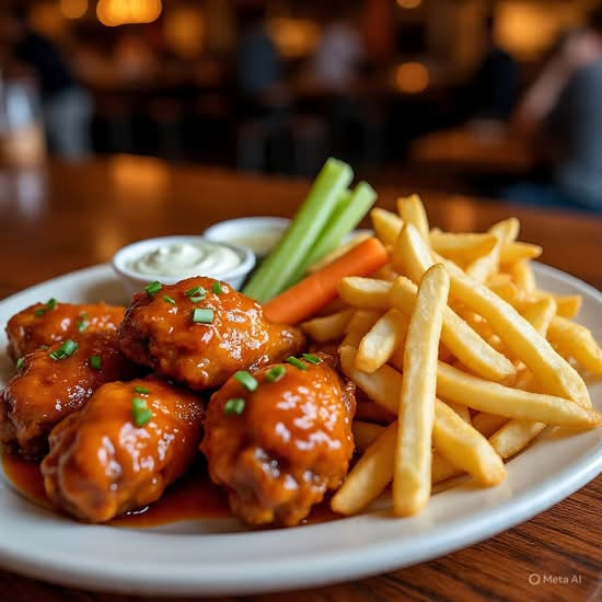 Buffalo Wings, Fries and Onion Rings