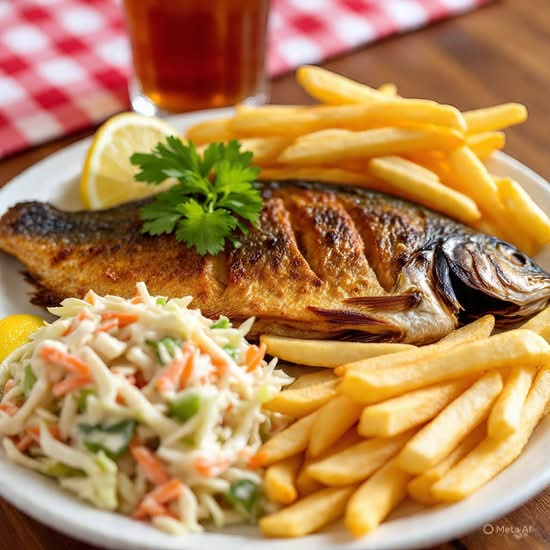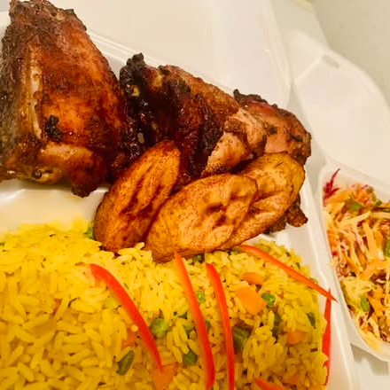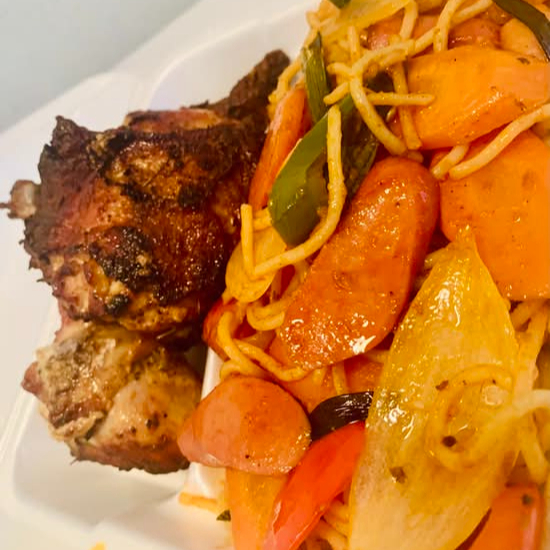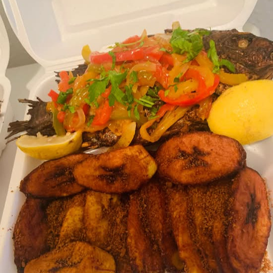 Roasted tilapia fish served in stirfry bell pepper mix and onion with organic coconut oil sprinkle with some chopped scallion and fresh parsley. This is a complete meal that comes fried plantains sprinkled with suya pepper, african style, coleslaw salad very crunchy, ketchupspor favor la ensalada que viene con la comida no incluye el pollo.