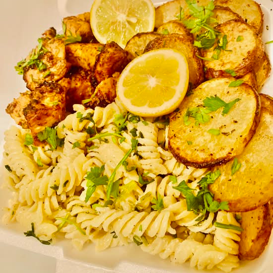 Macaroni twist in sour cream sauce with lemon zest and lemon juice pair with roasted boneless chicken breast and roasted potatoes. This is a complete meal that comes with any of the salads option spor, favor la ensalada que viene con la comida, no incluye el pollo.