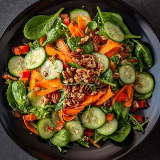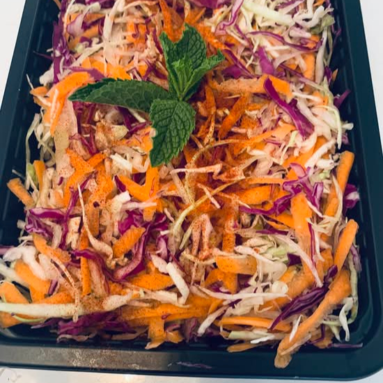 Ensalada fresca de repollo morado, zanahoria y pepino. En Lydia's Nigerian Table el sabor de los alimentos es tan importante como tu salud, así que utilizamos únicamente ingredientes frescos, 100% orgánicos, pollo libre de hormonas y antibióticos. Por favor la ensalada que viene con la comida no incluye el pollo.