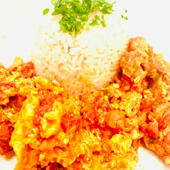 Africa style scrambled eggs in chops tomatoes jalapeño onion sauce served with snow peas or sweet peas stir fried and coleslaw salad and 2portion of jasmine ricepor favor la ensalada que viene con la comida no incluye el pollo, jalapeño onion sauce served with jasmine white rice jasmine.