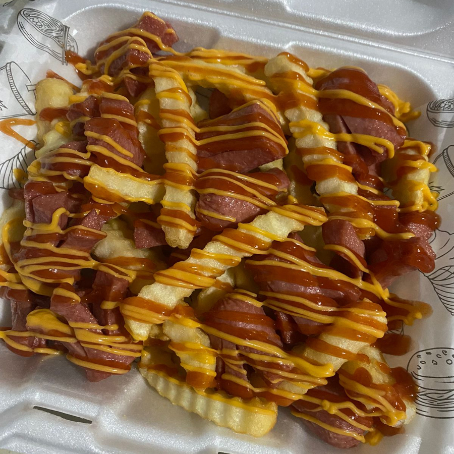 Trocitos de salchicha con papas a la francesa y aderezos