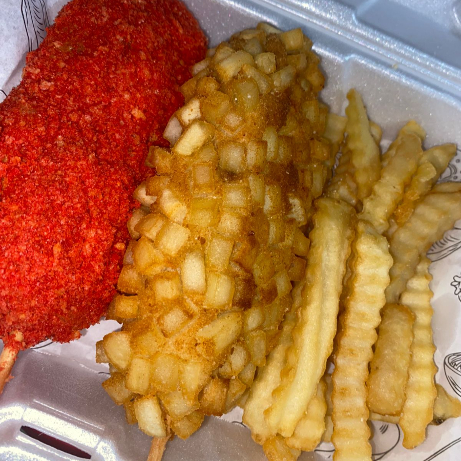 Dos banderillas a elegir con una porsion de papas fritas y aderezos, refresco de eleccion.