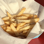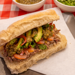 Torta de Barbacoa de Rib Eye - Barbacoa de rib eye ahumada, cebollita morada curtida, cilantro y salsa verde en pan ciabatta. Acompañado de papas fritas.