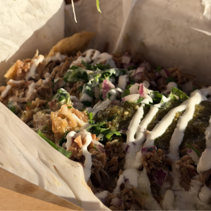 Chilaquiles en salsa verde, queso mozarella, barbacoa de rib eye ahumada, coronados con cebollita morada, cilantro, queso cotija y crema agria.