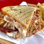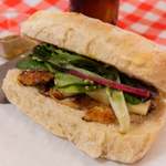 Torta de Pechuga de Pollo - Pechuga de pollo a la plancha, queso pepper jack, al pesto o al chipotle, en pan ciabatta. Acompañado de papas fritas.