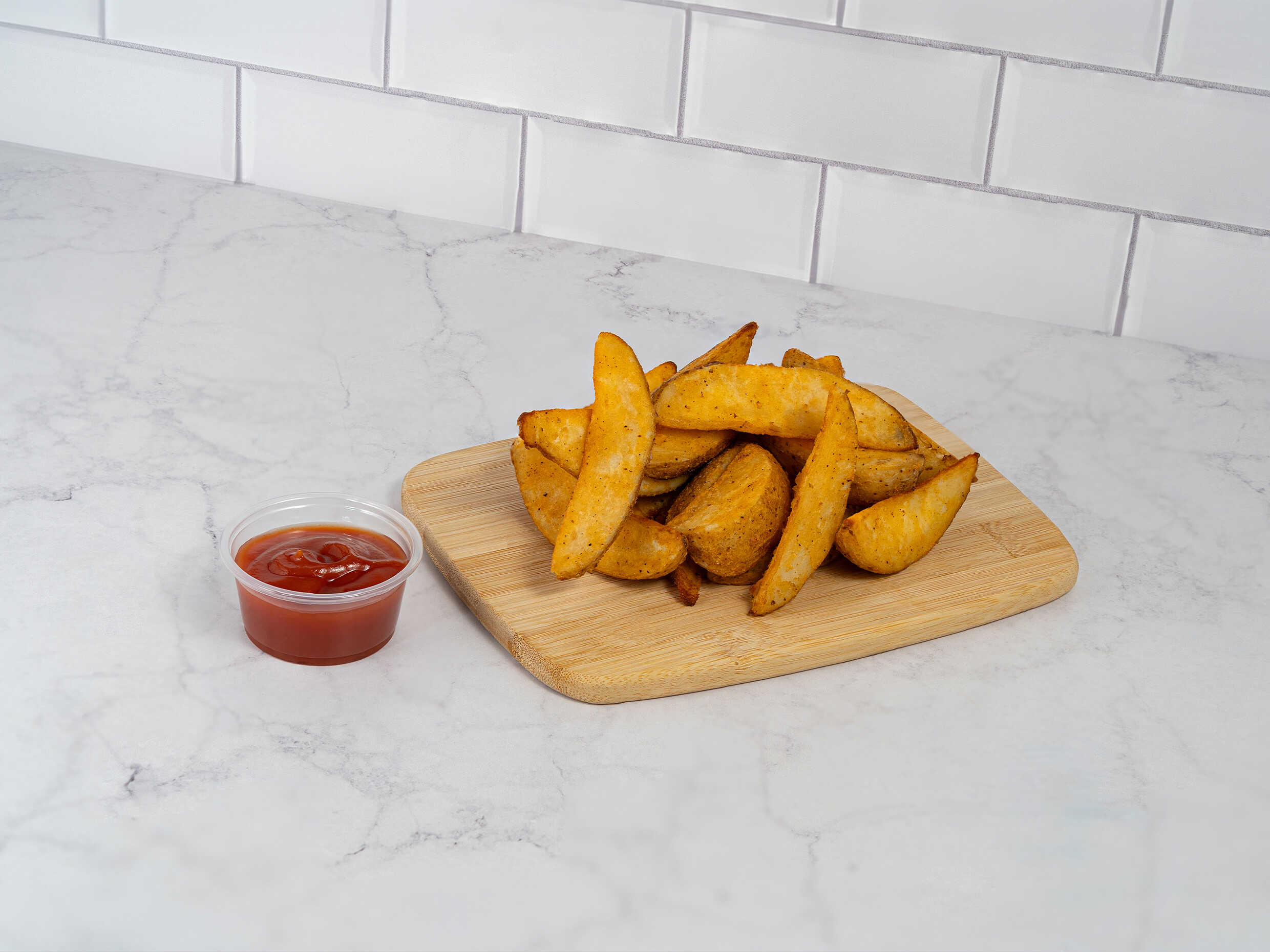 Deliciosas papas horneadas sazonadas en forma de gajo (290 gr) acompañadas con cátsup.