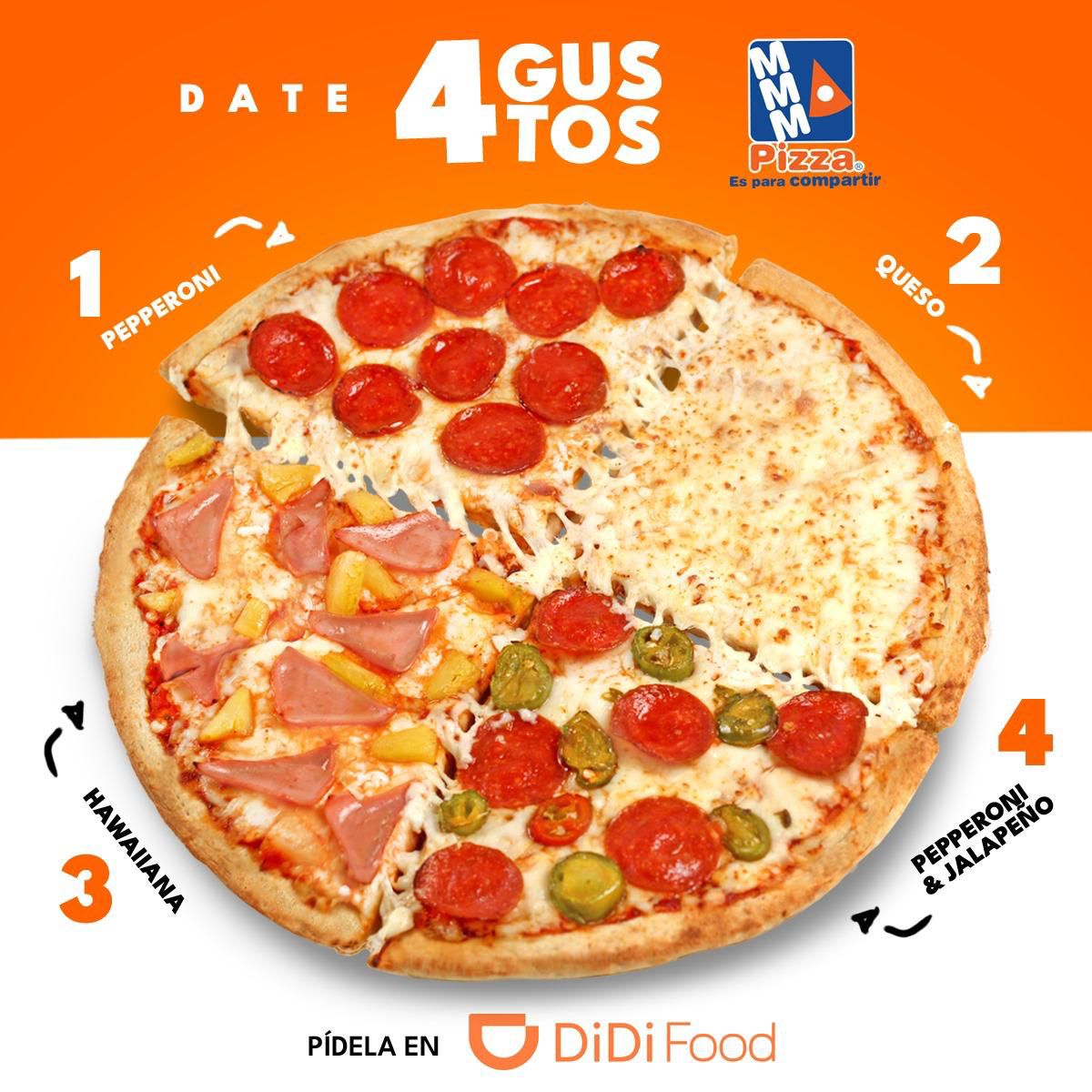 Pizza Grande (8 rebanadas), Tus 4 especialidades favortitas: Pepperoni, Queso, Pepperoni - Jalapeño y Hawaiiana